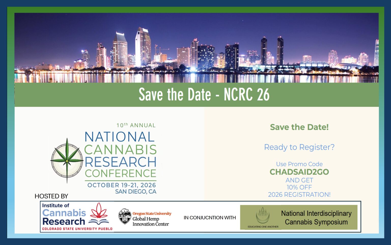 The ICR in collaboration with the Global Hemp Innovation Center and the National Interdisciplinary Cannabis Symposium is pleased to announce the 10th Annual National Cannabis Research Conference to be held in San Diego California next fall! Please click below to learn more.